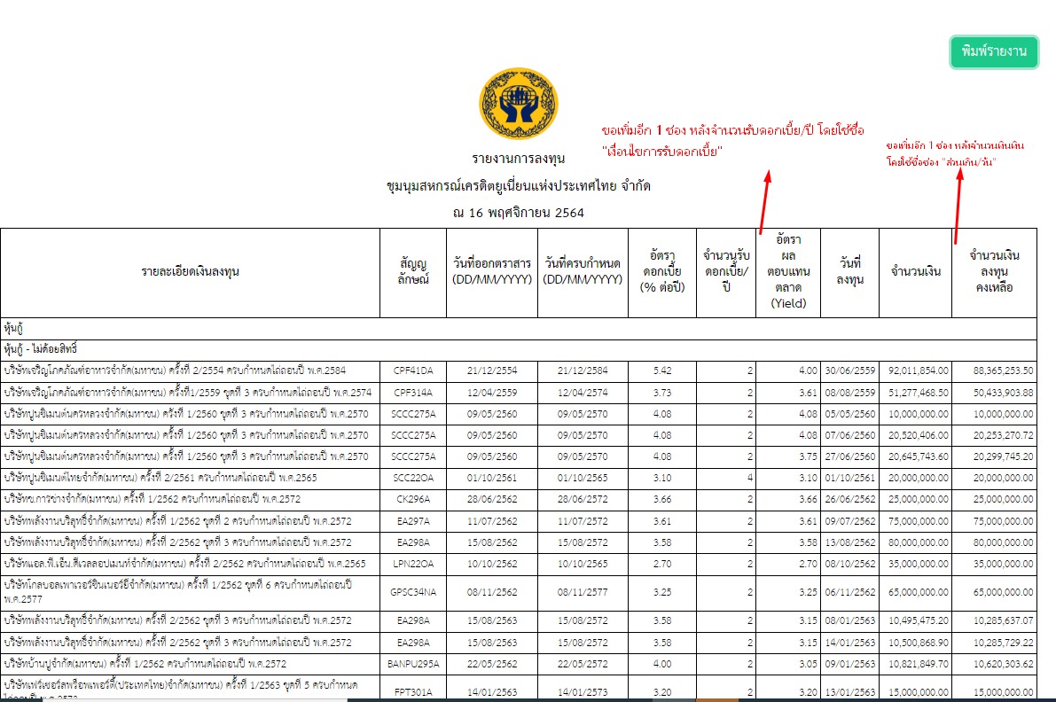 | 3 | จากการตรวจสอบรายงานดังกล่าว ยังขาดข้อมูลดังนี้ 1. หุ้นกู้ บมจ.การบินไทย (ทั้งหมด 4 รุ่น) 2. หุ้นสามัญ บจก.พัฒนาธุรกิจขนาดย่อม 3. หุ้นสามัญ บมจ.สหประกันชีวิต รบกวนเพิ่มข้อมูลให้ด้วยนะครับ | รอดำเนินการ | 2021-11-17 09:45:52 | CULT-FINANCE |