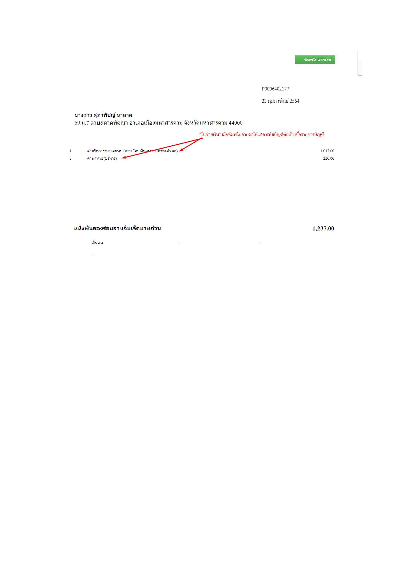 การแสดงข้อมูลใน "ใบจ่ายเงิน " เพื่อให้การทำงานมีการตรวจสอบความถูกต้องระหว่างแผนกการเงิน และแผนกบัญชี จึงขอให้แสดงรหัสบัญชีต่อท้ายชื่อรายการตามรูปประกอบ